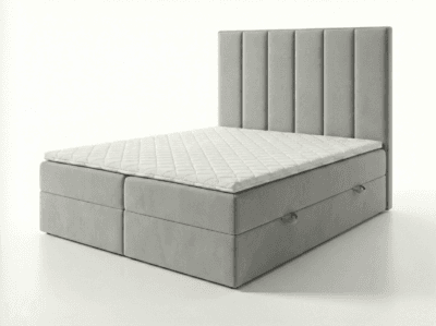 - Konstrukcja: Metalowa rama łóżka z siłownikami gazowymi zapewnia stabilność i długotrwałe wsparcie. Elastyczne listwy pod materacem gwarantują odpowiednią wentylację i komfort snu. Do wyboru rama łóżka z 34 lub 48 listwami. Łóżko posiada pojemnik na pościel, wykończony czarnym wigofilem, który zapewnia dodatkowe miejsce do przechowywania. Podłoga pojemnika na pościel składa się z czterech elementów wykonanych z płyty wiórowej 12 mm, obitej czarnym wigofilem. Konstrukcja łóżka wraz z podłogą opiera się na trójkątnych ślizgach o wysokości 15 mm, co zapewnia cyrkulację powietrza pod łóżkiem. Szkielet wykonany z płyty wiórowej o grubości 16 mm, wzmocniony elementami drewnianymi. Całość pokryta pianką T25 o grubości 5 cm+1 cm owaty, dzięki czemu łóżko jest miękkie w dotyku i nie czuć jego elementów konstrukcyjnych. Łóżko sypialniane dostępne w rozmiarach 120×200 cm, 140×200 cm, 160×200 cm, 180×200 cm, 200×200 cm.