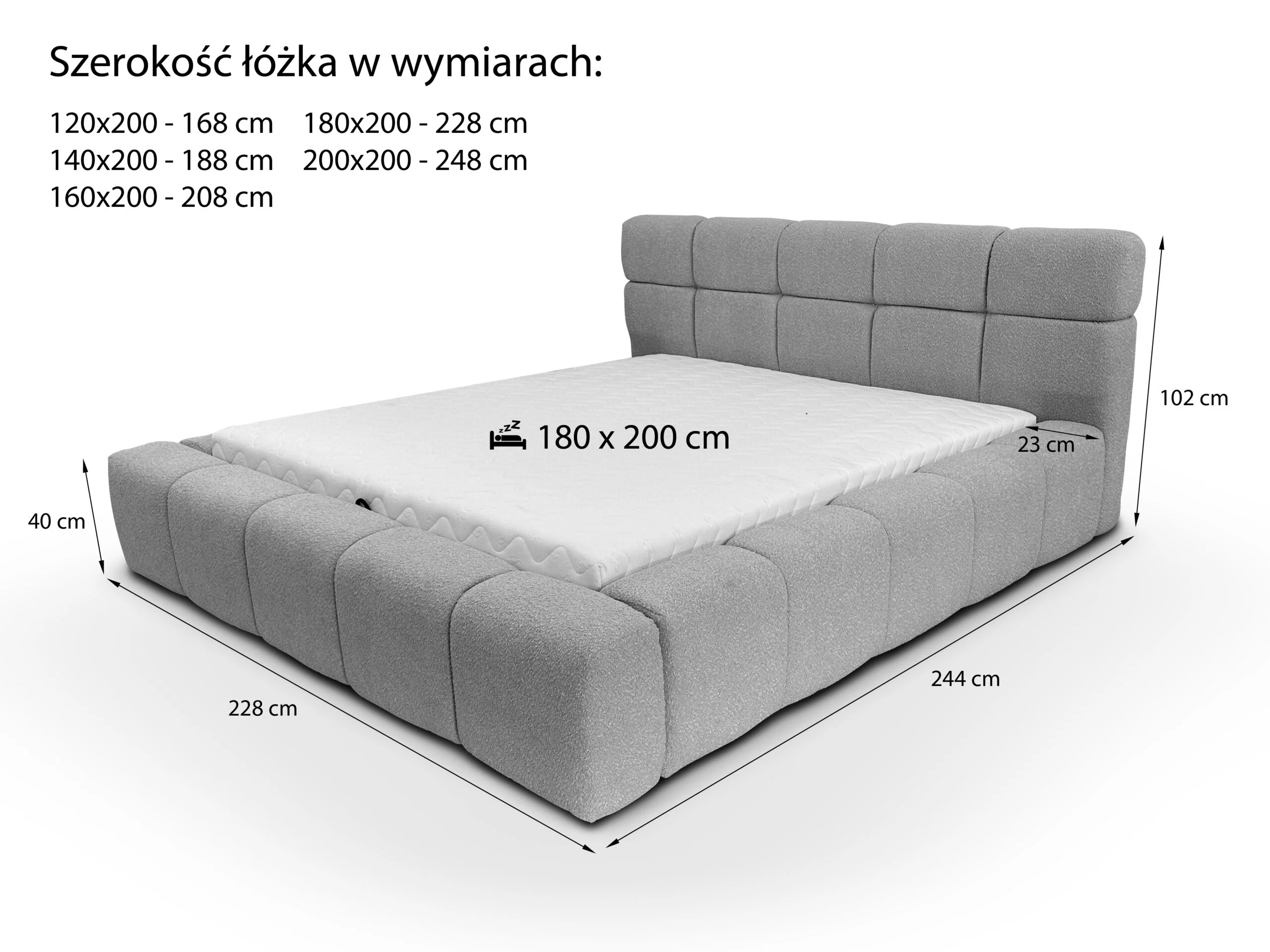 Tolerancja wymiarów +/- 2 cm. Wysokość wezgłowia taka sama dla każdego rozmiaru łóżka. Osadzenie materaca ok. 15 cm.