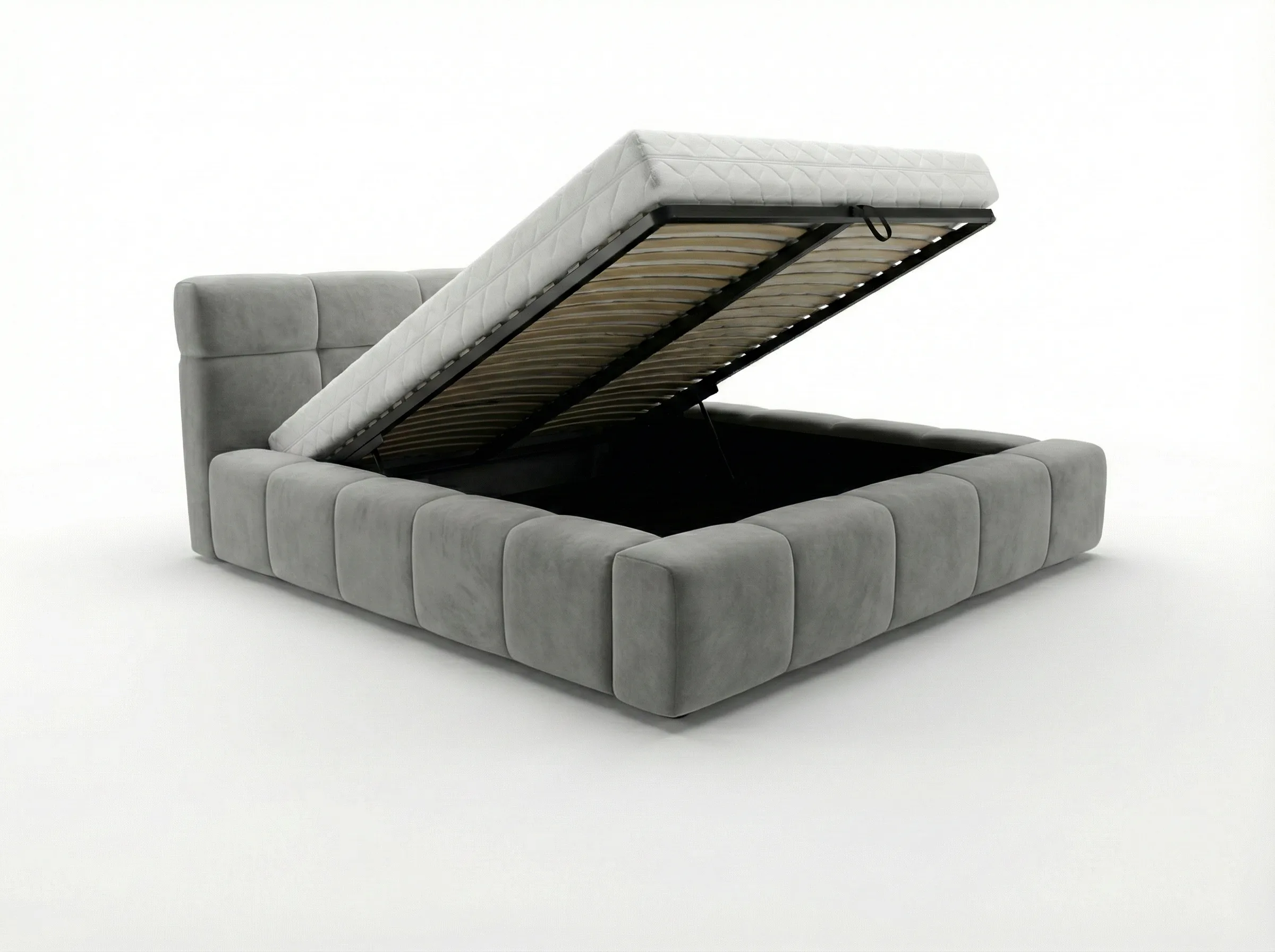 - Konstrukcja: Metalowa rama łóżka z siłownikami gazowymi zapewnia stabilność i długotrwałe wsparcie. Elastyczne listwy pod materacem gwarantują odpowiednią wentylację i komfort snu. Do wyboru rama łóżka z 34 lub 48 listwami. Łóżko posiada pojemnik na pościel, wykończony czarnym wigofilem, który zapewnia dodatkowe miejsce do przechowywania. Podłoga pojemnika na pościel składa się z czterech elementów wykonanych z płyty wiórowej 12 mm, obitej czarnym wigofilem. Konstrukcja łóżka wraz z podłogą opiera się na trójkątnych ślizgach o wysokości 15 mm, co zapewnia cyrkulację powietrza pod łóżkiem. Szkielet wykonany z płyty wiórowej o grubości 16 mm, wzmocniony elementami drewnianymi. Całość pokryta pianką T25 o grubości 5 cm+1 cm owaty, dzięki czemu łóżko jest miękkie w dotyku i nie czuć jego elementów konstrukcyjnych. Łóżko sypialniane dostępne w rozmiarach 120×200 cm, 140×200 cm, 160×200 cm, 180×200 cm, 200×200 cm.