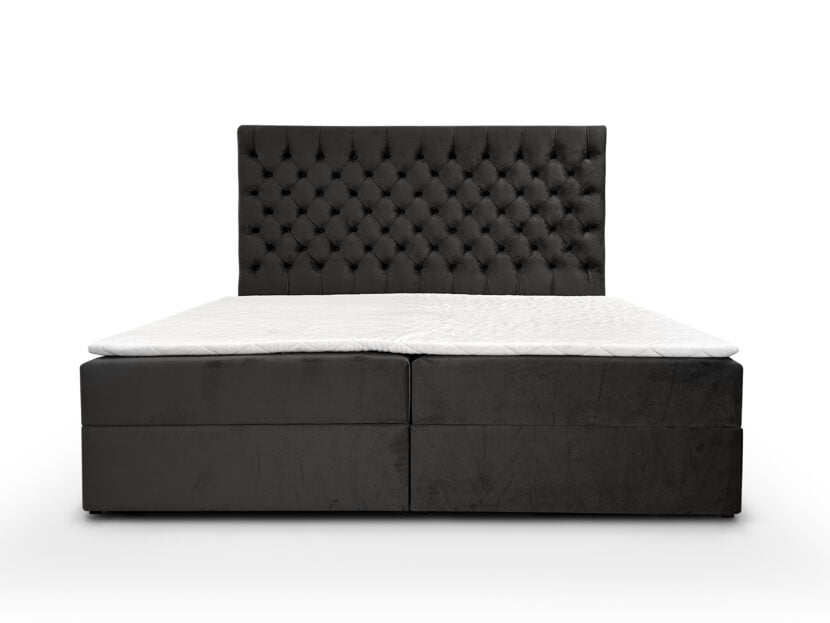 • Konstrukcja: Konstrukcja łóżka opiera się na trójkątnych ślizgach o wysokości 15 mm, co zapewnia cyrkulację powietrza pod łóżkiem. Szkielet wykonany z płyty wiórowej o grubości 16 mm, wzmocniony elementami drewnianymi. Całość pokryta pianką T25. Skrzynie na pościel wykonane z płyty wiórowej 16 mm, w białym laminacie. Łóżko posiada automaty z siłownikami gazowymi, które wspomagają otwieranie pojemników na pościel. Łóżko składa się z wbudowanego materaca bonellowego lub pocketowego (do wyboru), który z góry zaszyty jest tkaniną Anty Slip, dzięki której topper nie przesuwa się. Łóżko tapicerowane dostępne w rozmiarach 120×200 cm, 140×200 cm, 160×200 cm, 180×200 cm, 200×200 cm.