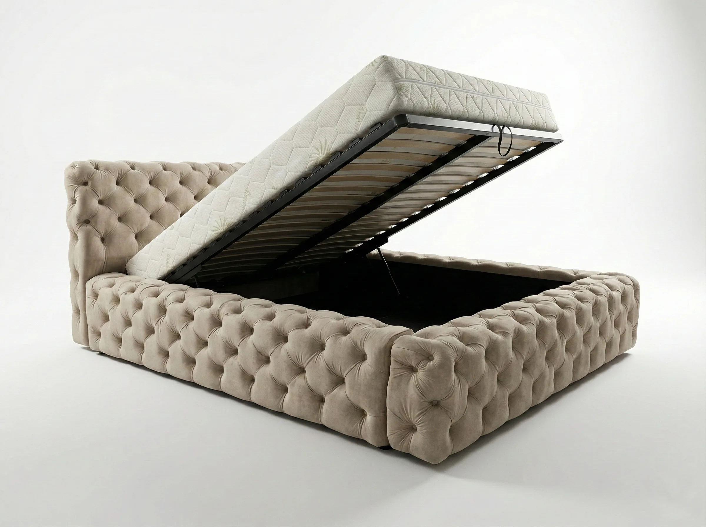 - Konstrukcja: Metalowa rama łóżka z siłownikami gazowymi zapewnia stabilność i długotrwałe wsparcie. Elastyczne listwy pod materacem gwarantują odpowiednią wentylację i komfort snu. Do wyboru rama łóżka z 34 lub 48 listwami. Łóżko posiada pojemnik na pościel, wykończony czarnym wigofilem, który zapewnia dodatkowe miejsce do przechowywania. Podłoga pojemnika na pościel składa się z czterech elementów wykonanych z płyty wiórowej 12 mm, obitej czarnym wigofilem. Konstrukcja łóżka wraz z podłogą opiera się na trójkątnych ślizgach o wysokości 15 mm, co zapewnia cyrkulację powietrza pod łóżkiem. Szkielet wykonany z płyty wiórowej o grubości 16 mm, wzmocniony elementami drewnianymi. Całość pokryta pianką T25 o grubości 5 cm+1 cm owaty, dzięki czemu łóżko jest miękkie w dotyku i nie czuć jego elementów konstrukcyjnych. Łóżko sypialniane dostępne w rozmiarach 120×200 cm, 140×200 cm, 160×200 cm, 180×200 cm, 200×200 cm (podane wymiary dotyczą materaca).