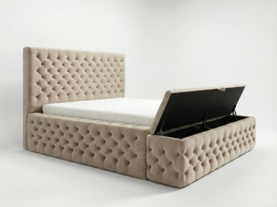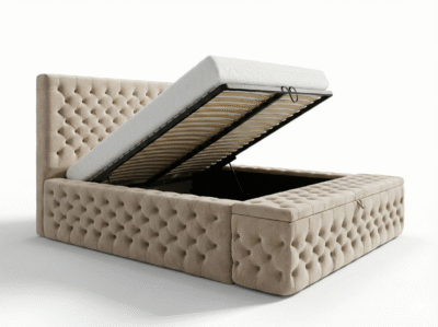 - Konstrukcja: Metalowa rama łóżka z siłownikami gazowymi zapewnia stabilność i długotrwałe wsparcie. Elastyczne listwy pod materacem gwarantują odpowiednią wentylację i komfort snu. Do wyboru rama łóżka z 34 lub 48 listwami. Łóżko posiada pojemnik na pościel, wykończony czarnym wigofilem, który zapewnia dodatkowe miejsce do przechowywania. Podłoga pojemnika na pościel składa się z czterech elementów wykonanych z płyty wiórowej 12 mm, obitej czarnym wigofilem. Konstrukcja łóżka wraz z podłogą opiera się na trójkątnych ślizgach o wysokości 15 mm, co zapewnia cyrkulację powietrza pod łóżkiem. Szkielet wykonany z płyty wiórowej o grubości 16 mm, wzmocniony elementami drewnianymi. Całość pokryta pianką T25 o grubości 5 cm+1 cm owaty, dzięki czemu łóżko jest miękkie w dotyku i nie czuć jego elementów konstrukcyjnych. Skrzynia umiejscowiona na froncie łóżka otwierana przy pomocy automatów sprężynowych. W środku wykończona czarnym wigofilem. Łóżko tapicerowane dostępne w rozmiarach 120×200 cm, 140×200 cm, 160×200 cm, 180×200 cm, 200×200 cm.