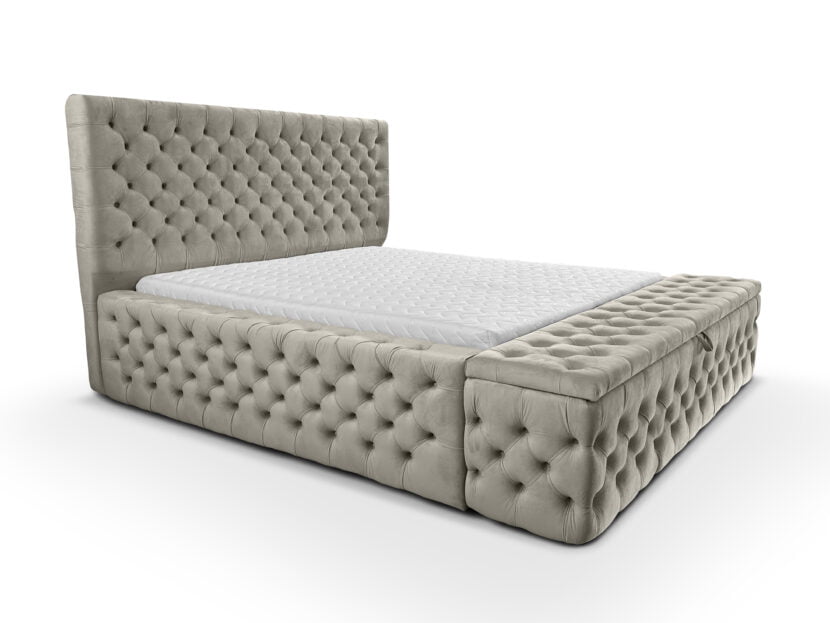 Łóżko sypialniane Chesterfield III Box zachwyca stylem i wygodą. Jest doskonałym wyborem dla osób poszukujących połączenia tradycyjnego designu z komfortem. Umiejscowiona na froncie ławeczka pełni jednocześnie funkcję skrzyni, zapewniając dodatkowe miejsce do przechowywania.