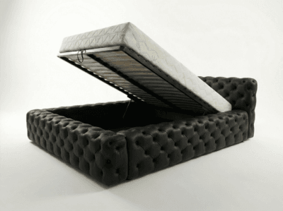 - Konstrukcja: Metalowa rama łóżka z siłownikami gazowymi zapewnia stabilność i długotrwałe wsparcie. Elastyczne listwy pod materacem gwarantują odpowiednią wentylację i komfort snu. Do wyboru rama łóżka z 34 lub 48 listwami. Łóżko posiada pojemnik na pościel, wykończony czarnym wigofilem, który zapewnia dodatkowe miejsce do przechowywania. Podłoga pojemnika na pościel składa się z czterech elementów wykonanych z płyty wiórowej 12 mm, obitej czarnym wigofilem. Konstrukcja łóżka wraz z podłogą opiera się na trójkątnych ślizgach o wysokości 15 mm, co zapewnia cyrkulację powietrza pod łóżkiem. Szkielet wykonany z płyty wiórowej o grubości 16 mm, wzmocniony elementami drewnianymi. Całość pokryta pianką T25 o grubości 5 cm+1 cm owaty, dzięki czemu łóżko jest miękkie w dotyku i nie czuć jego elementów konstrukcyjnych. Łóżko sypialniane dostępne w rozmiarach 120×200 cm, 140×200 cm, 160×200 cm, 180×200 cm, 200×200 cm.