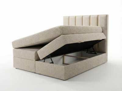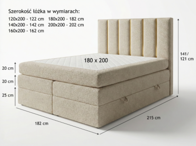 - Konstrukcja: Konstrukcja łóżka opiera się na trójkątnych ślizgach o wysokości 15 mm, co zapewnia cyrkulację powietrza pod łóżkiem. Szkielet wykonany z płyty wiórowej o grubości 16 mm, wzmocniony elementami drewnianymi. Całość pokryta pianką T25. Skrzynie na pościel wykonane z płyty wiórowej 16 mm, w białym laminacie. Łóżko posiada automaty z siłownikami gazowymi, które wspomagają otwieranie pojemników na pościel. Łóżko składa się z wbudowanego materaca bonellowego, który z góry zaszyty jest tkaniną Anty Slip, zapobiegającą przesuwaniu się materaca nawierzchniowego. Materac nawierzchniowy o twardości H3, H4 lub H5 obszyty tkaniną w kolorze łóżka, powierzchnia spania wykończona pikowanym materiałem materacowym, spód wykończony tkaniną Anty Slip. Łóżko tapicerowane dostępne w rozmiarach 120×200 cm, 140×200 cm, 160×200 cm, 180×200 cm, 200×200 cm.