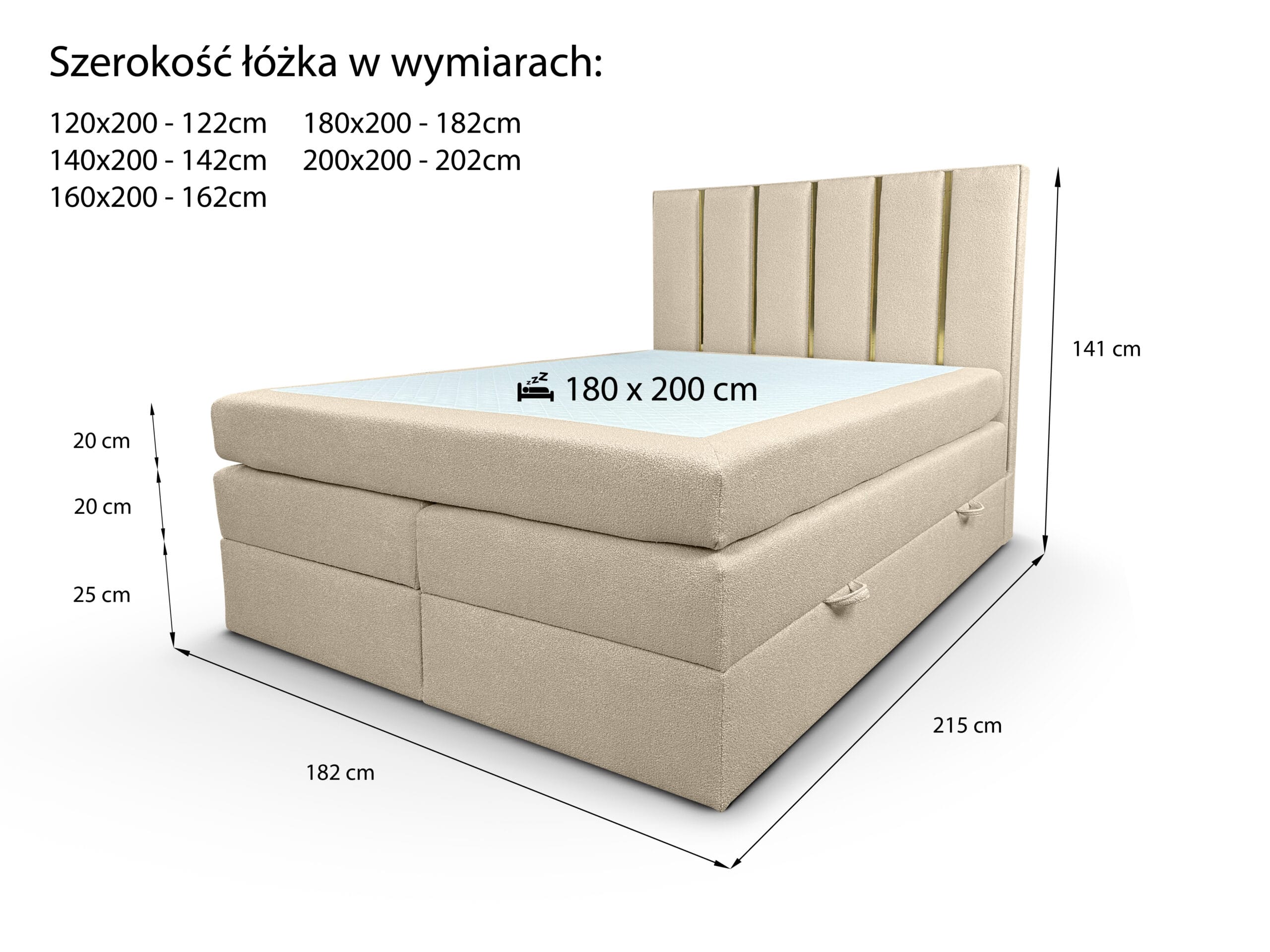 - Konstrukcja: Konstrukcja łóżka opiera się na trójkątnych ślizgach o wysokości 15 mm, co zapewnia cyrkulację powietrza pod łóżkiem. Szkielet wykonany z płyty wiórowej o grubości 16 mm, wzmocniony elementami drewnianymi. Całość pokryta pianką T25. Skrzynie na pościel wykonane z płyty wiórowej 16 mm, w białym laminacie. Łóżko posiada automaty z siłownikami gazowymi, które wspomagają otwieranie pojemników na pościel. Łóżko składa się z wbudowanego materaca bonellowego, który z góry zaszyty jest tkaniną Anty Slip, zapobiegającą przesuwaniu się materaca nawierzchniowego. Materac nawierzchniowy o twardości H3, H4 lub H5 obszyty tkaniną w kolorze łóżka, powierzchnia spania wykończona pikowanym materiałem materacowym, spód wykończony tkaniną Anty Slip. Łóżko tapicerowane dostępne w rozmiarach 120×200 cm, 140×200 cm, 160×200 cm, 180×200 cm, 200×200 cm.