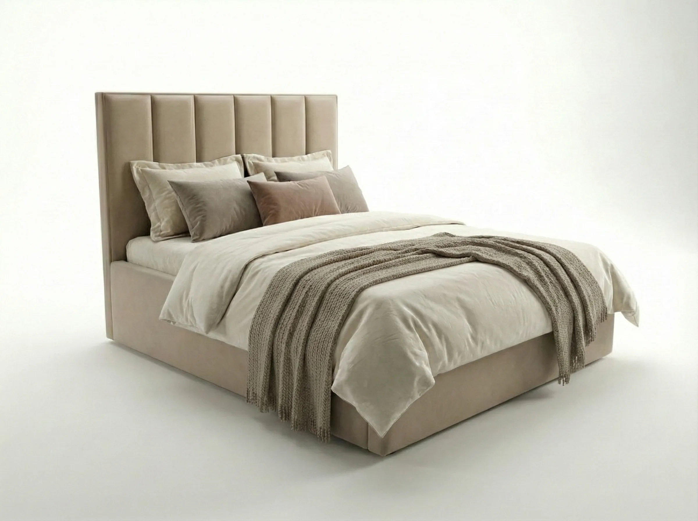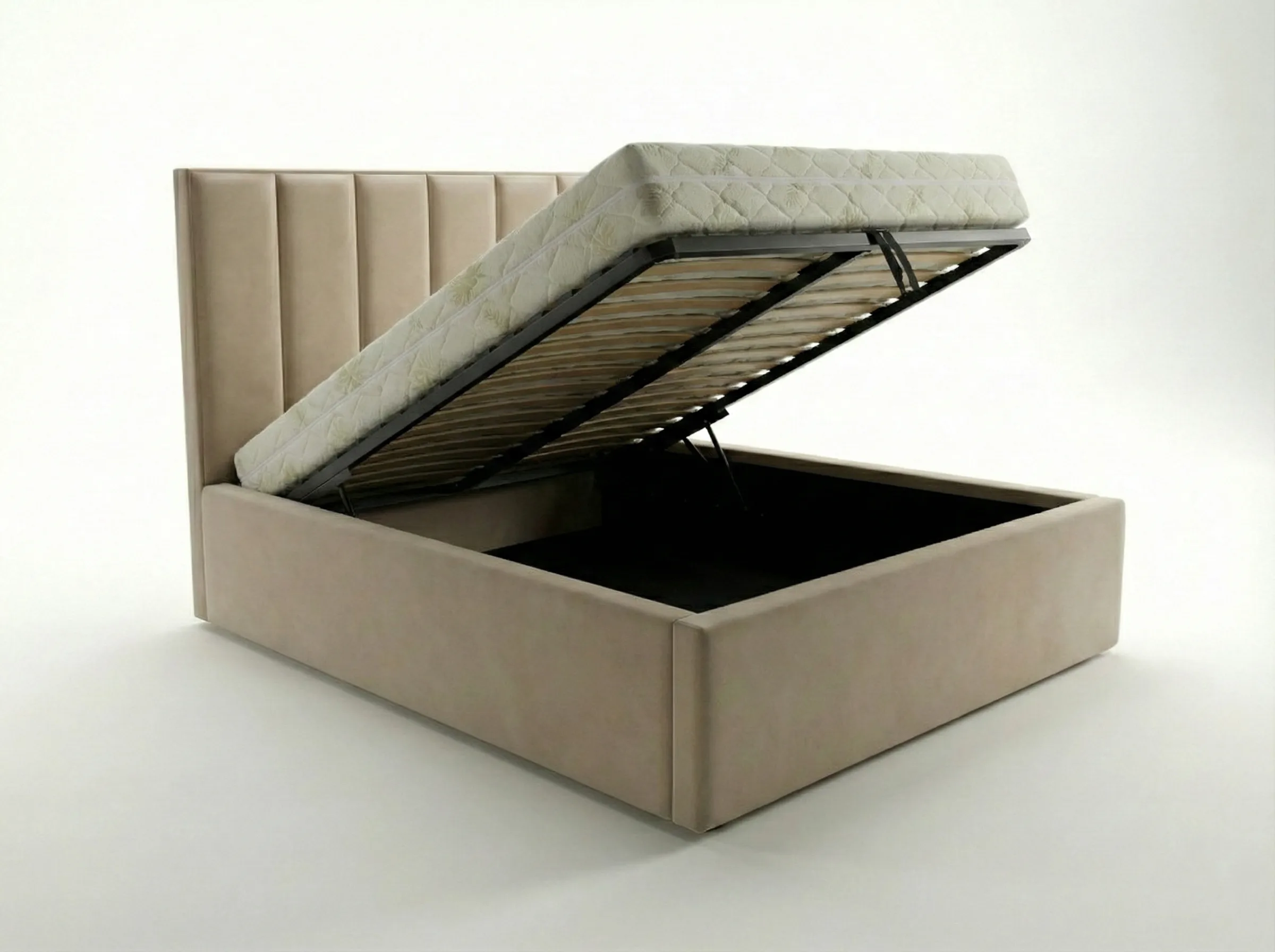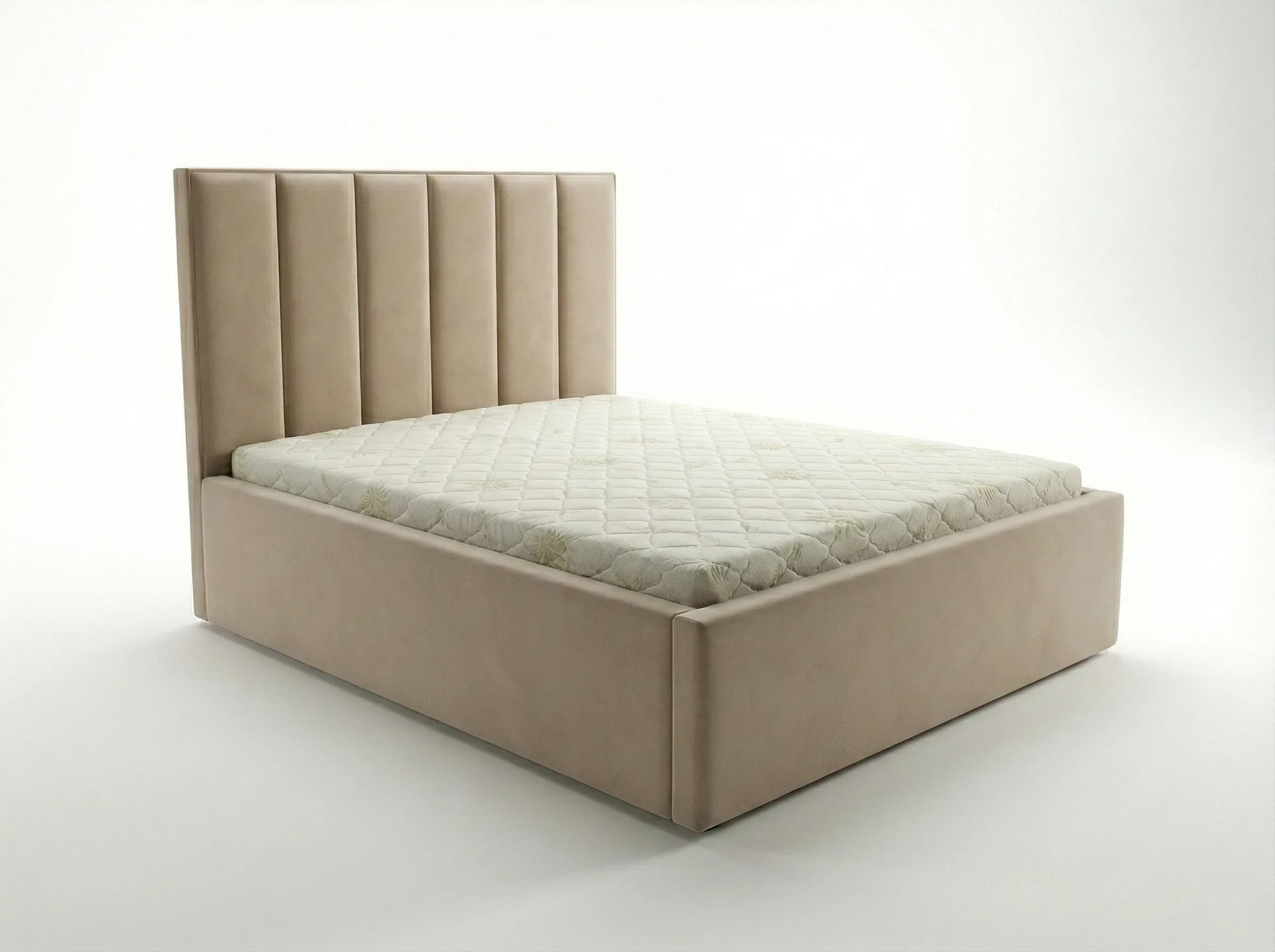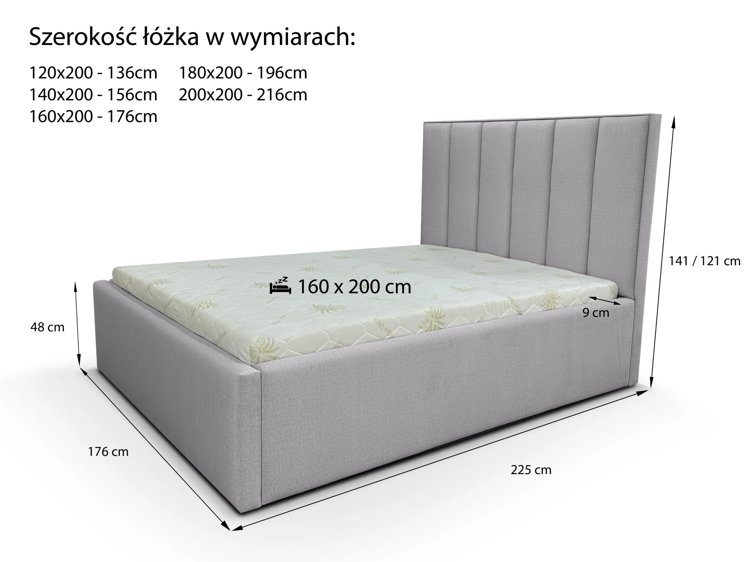 - Konstrukcja: Metalowa rama łóżka z siłownikami gazowymi zapewnia stabilność i długotrwałe wsparcie. Elastyczne listwy pod materacem gwarantują odpowiednią wentylację i komfort snu. Do wyboru rama łóżka z 34 lub 48 listwami. Łóżko posiada pojemnik na pościel, wykończony czarnym wigofilem, który zapewnia dodatkowe miejsce do przechowywania. Podłoga pojemnika na pościel składa się z czterech elementów wykonanych z płyty wiórowej 12 mm, obitej czarnym wigofilem. Konstrukcja łóżka wraz z podłogą opiera się na trójkątnych ślizgach o wysokości 15 mm, co zapewnia cyrkulację powietrza pod łóżkiem. Szkielet wykonany z płyty wiórowej o grubości 16 mm, wzmocniony elementami drewnianymi. Całość pokryta pianką T25 i owatą. Łóżko sypialniane dostępne w rozmiarach 120×200 cm, 140×200 cm, 160×200 cm, 180×200 cm, 200×200 cm (podane wymiary dotyczą materaca).