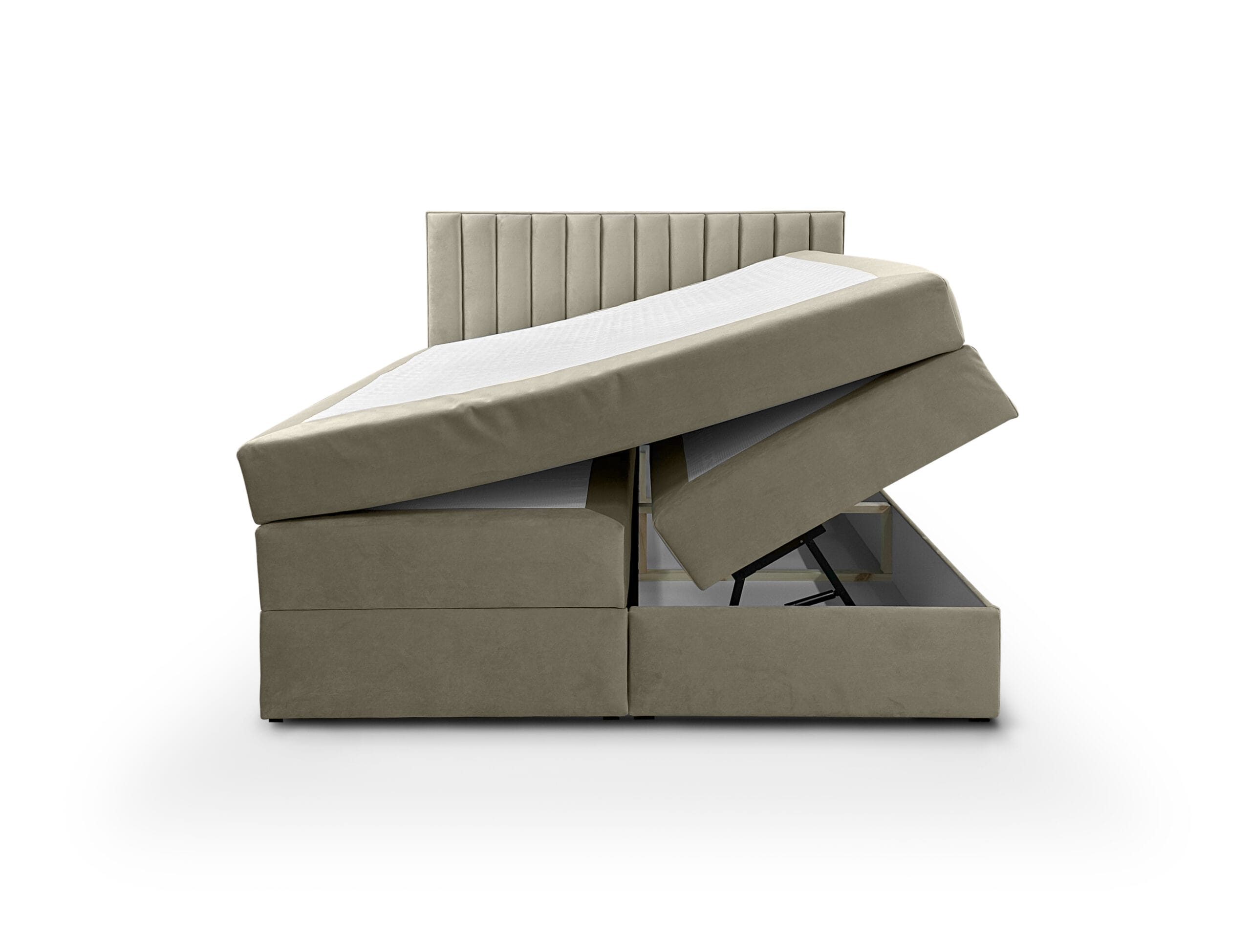 - Konstrukcja: Konstrukcja łóżka opiera się na trójkątnych ślizgach o wysokości 15 mm, co zapewnia cyrkulację powietrza pod łóżkiem. Szkielet wykonany z płyty wiórowej o grubości 16 mm, wzmocniony elementami drewnianymi. Całość pokryta pianką T25. Skrzynie na pościel wykonane z płyty wiórowej 16 mm, w białym laminacie. Łóżko posiada automaty z siłownikami gazowymi, które wspomagają otwieranie pojemników na pościel. Łóżko składa się z wbudowanego materaca bonellowego, który z góry zaszyty jest tkaniną Anty Slip, zapobiegającą przesuwaniu się materaca nawierzchniowego. Materac nawierzchniowy o twardości H3, H4 lub H5 obszyty tkaniną w kolorze łóżka, powierzchnia spania wykończona pikowanym materiałem materacowym, spód wykończony tkaniną Anty Slip. Łóżko tapicerowane dostępne w rozmiarach 120×200 cm, 140×200 cm, 160×200 cm, 180×200 cm, 200×200 cm.