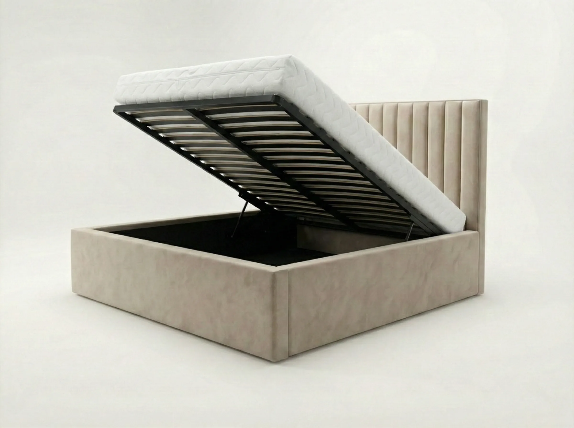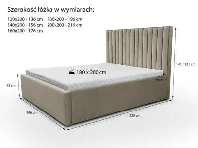 • Konstrukcja: Metalowa rama łóżka z siłownikami gazowymi zapewnia stabilność i długotrwałe wsparcie. Elastyczne listwy pod materacem gwarantują odpowiednią wentylację i komfort snu. Do wyboru rama łóżka z 34 lub 48 listwami. Łóżko posiada pojemnik na pościel, wykończony czarnym wigofilem, który zapewnia dodatkowe miejsce do przechowywania. Podłoga pojemnika na pościel składa się z  czterech elementów wykonanych z płyty wiórowej 12 mm, obitej czarnym wigofilem. Konstrukcja łóżka wraz z podłogą opiera się na trójkątnych ślizgach o wysokości 15 mm, co zapewnia cyrkulację powietrza pod łóżkiem. Szkielet wykonany z płyty wiórowej o grubości 16 mm, wzmocniony elementami drewnianymi. Całość pokryta pianką T25 i owatą. Łóżko sypialniane dostępne w rozmiarach 120×200 cm, 140×200 cm, 160×200 cm, 180×200 cm, 200×200 cm (podane wymiary dotyczą materaca).