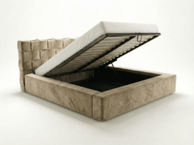 • Konstrukcja: Metalowa rama łóżka z siłownikami gazowymi zapewnia stabilność i długotrwałe wsparcie. Elastyczne listwy pod materacem gwarantują odpowiednią wentylację i komfort snu. Do wyboru rama łóżka z 34 lub 48 listwami. Łóżko posiada pojemnik na pościel, wykończony czarnym wigofilem, który zapewnia dodatkowe miejsce do przechowywania. Podłoga pojemnika na pościel składa się z  czterech elementów wykonanych z płyty wiórowej 12 mm, obitej czarnym wigofilem. Konstrukcja łóżka wraz z podłogą opiera się na trójkątnych ślizgach o wysokości 15 mm, co zapewnia cyrkulację powietrza pod łóżkiem. Szkielet wykonany z płyty wiórowej o grubości 16 mm, wzmocniony elementami drewnianymi. Całość pokryta pianką T25 i owatą. Łóżko sypialniane dostępne w rozmiarach 120×200 cm, 140×200 cm, 160×200 cm, 180×200 cm, 200×200 cm.