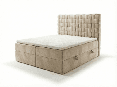 - Konstrukcja: Konstrukcja łóżka opiera się na trójkątnych ślizgach o wysokości 15 mm, co zapewnia cyrkulację powietrza pod łóżkiem. Szkielet wykonany z płyty wiórowej o grubości 16 mm, wzmocniony elementami drewnianymi. Całość pokryta pianką T25. Skrzynie na pościel wykonane z płyty wiórowej 16 mm, w białym laminacie. Łóżko posiada automaty z siłownikami gazowymi, które wspomagają otwieranie pojemników na pościel. Łóżko składa się z wbudowanego materaca bonellowego lub pocketowego (do wyboru), który z góry zaszyty jest tkaniną Anty Slip, dzięki której topper nie przesuwa się. Łóżko tapicerowane dostępne w rozmiarach 120×200 cm, 140×200 cm, 160×200 cm, 180×200 cm, 200×200 cm.