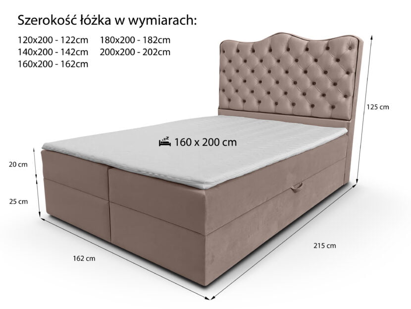 Tolerancja wymiarów +/- 2 cm. Wysokość wezgłowia taka sama dla każdego rozmiaru łóżka.
