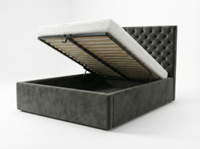 • Konstrukcja: Metalowa rama łóżka z siłownikami gazowymi zapewnia stabilność i długotrwałe wsparcie. Elastyczne listwy pod materacem gwarantują odpowiednią wentylację i komfort snu. Do wyboru rama łóżka z 34 lub 48 listwami. Łóżko posiada pojemnik na pościel, wykończony czarnym wigofilem, który zapewnia dodatkowe miejsce do przechowywania. Podłoga pojemnika na pościel składa się z  czterech elementów wykonanych z płyty wiórowej 12 mm, obitej czarnym wigofilem. Konstrukcja łóżka wraz z podłogą opiera się na trójkątnych ślizgach o wysokości 15 mm, co zapewnia cyrkulację powietrza pod łóżkiem. Szkielet wykonany z płyty wiórowej o grubości 16 mm, wzmocniony elementami drewnianymi. Całość pokryta pianką T25 i owatą. Łóżko sypialniane dostępne w rozmiarach 120×200 cm, 140×200 cm, 160×200 cm, 180×200 cm, 200×200 cm.