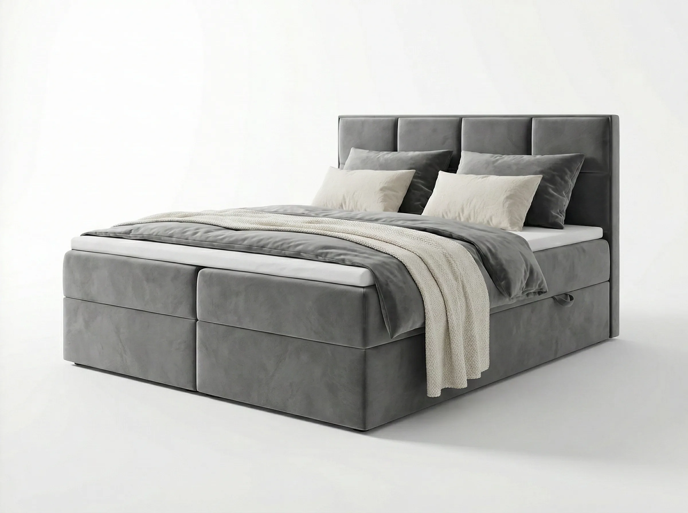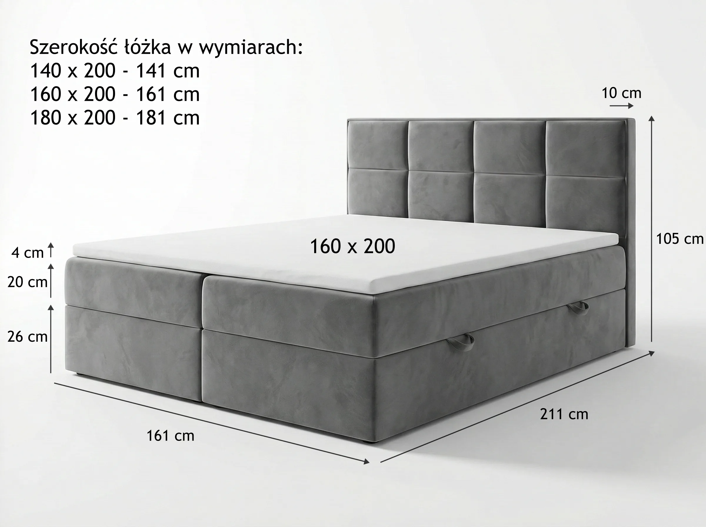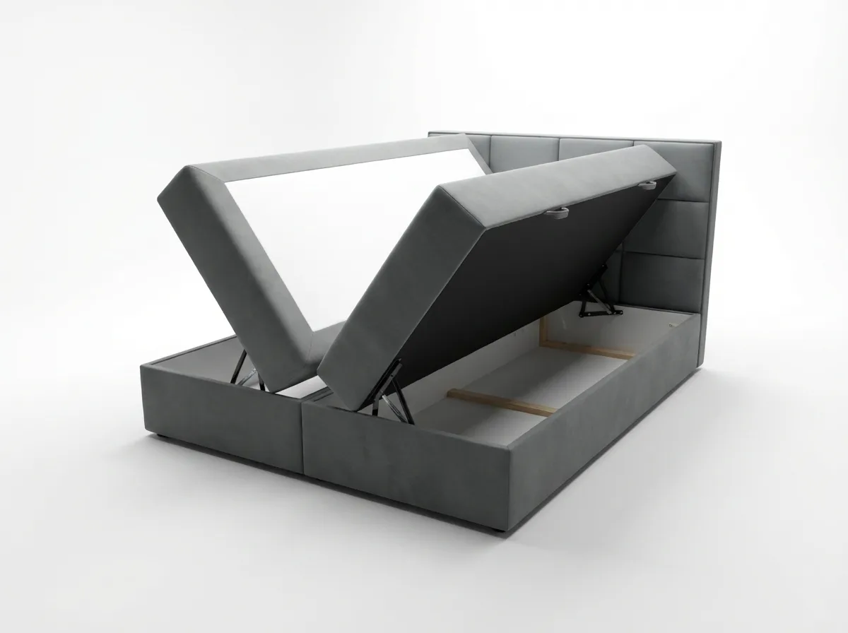 • Konstrukcja: Konstrukcja łóżka opiera się na trójkątnych ślizgach o wysokości 15 mm, co zapewnia cyrkulację powietrza pod łóżkiem. Szkielet wykonany z płyty wiórowej o grubości 16 mm, wzmocniony elementami drewnianymi. Całość pokryta pianką T25. Skrzynie na pościel wykonane z płyty wiórowej 16 mm, w białym laminacie. Łóżko posiada mocne automaty ze sprężynami, które wspomagają otwieranie pojemników na pościel. Łóżko składa się z wbudowanego materaca bonellowego lub pocketowego (do wyboru), który z góry zaszyty jest tkaniną Anty Slip, dzięki której topper nie przesuwa się. Łóżko tapicerowane dostępne w rozmiarach 140×200 cm, 160×200 cm, 180×200 cm. Zagłowie mocowane przy użyciu 4 śrub 8 mm, co zapewnia jego stabilność.
