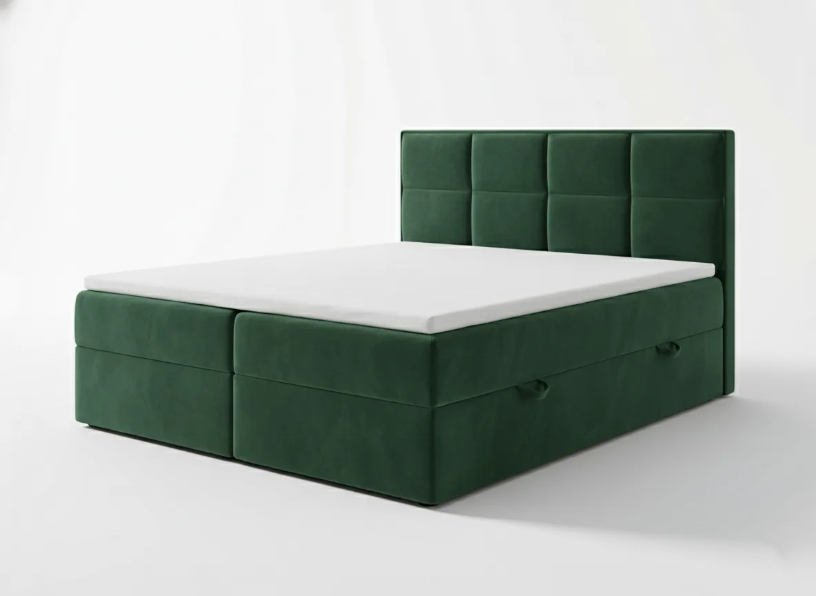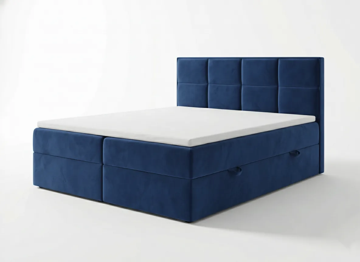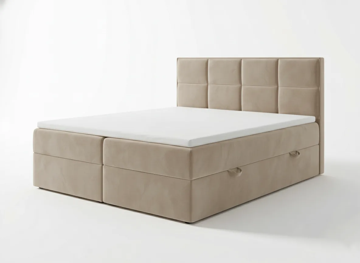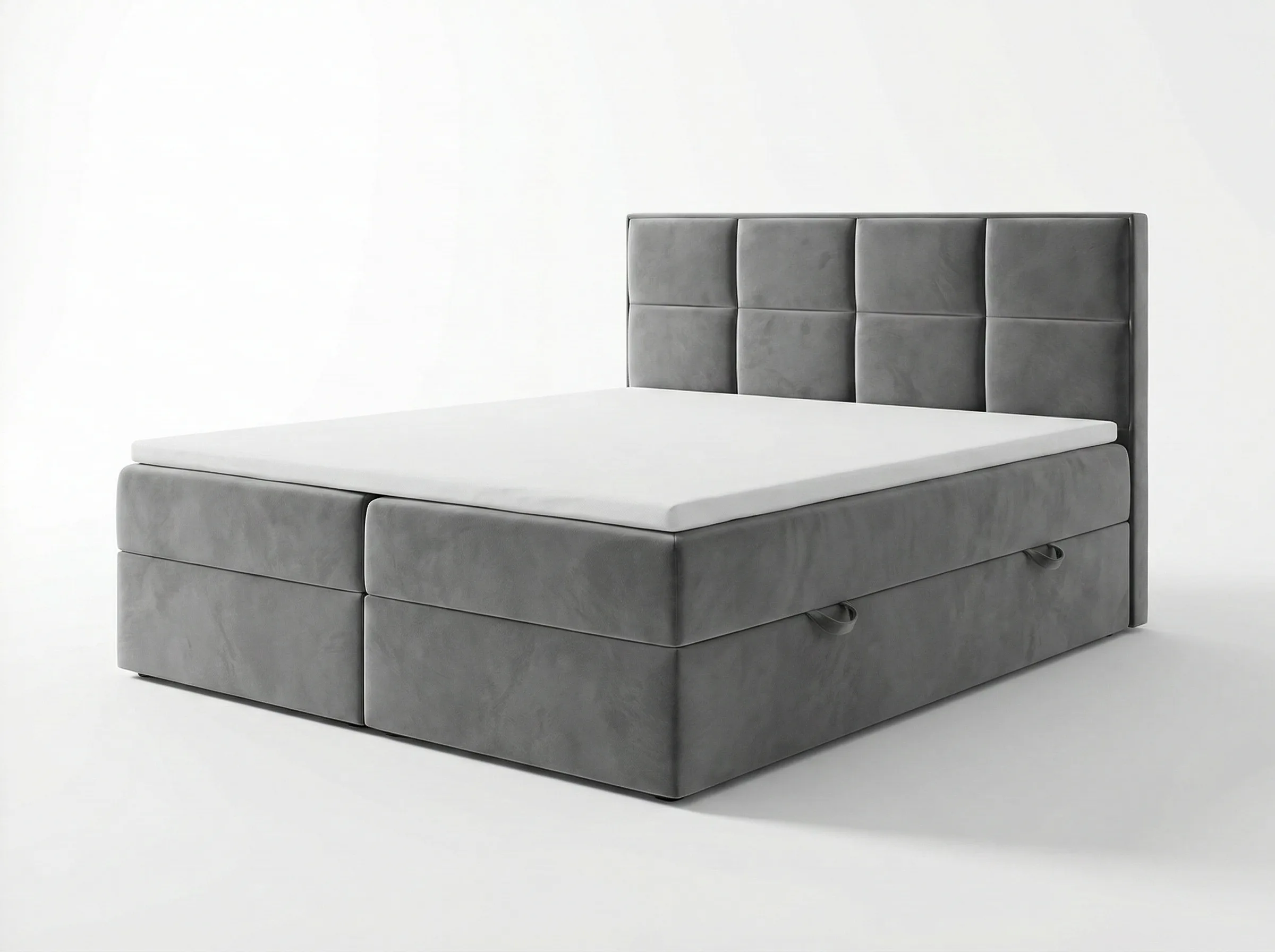 • Konstrukcja: Konstrukcja łóżka opiera się na trójkątnych ślizgach o wysokości 15 mm, co zapewnia cyrkulację powietrza pod łóżkiem. Szkielet wykonany z płyty wiórowej o grubości 16 mm, wzmocniony elementami drewnianymi. Całość pokryta pianką T25. Skrzynie na pościel wykonane z płyty wiórowej 16 mm, w białym laminacie. Łóżko posiada mocne automaty ze sprężynami, które wspomagają otwieranie pojemników na pościel. Łóżko składa się z wbudowanego materaca bonellowego lub pocketowego (do wyboru), który z góry zaszyty jest tkaniną Anty Slip, dzięki której topper nie przesuwa się. Łóżko tapicerowane dostępne w rozmiarach 140×200 cm, 160×200 cm, 180×200 cm. Zagłowie mocowane przy użyciu 4 śrub 8 mm, co zapewnia jego stabilność.