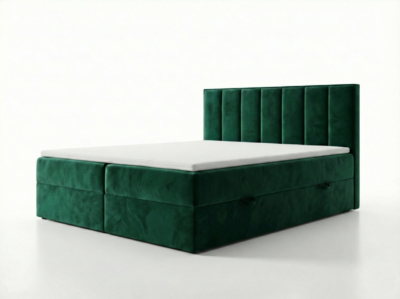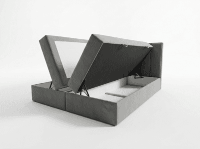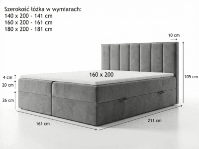 - Konstrukcja: Konstrukcja łóżka opiera się na trójkątnych ślizgach o wysokości 15 mm, co zapewnia cyrkulację powietrza pod łóżkiem. Szkielet wykonany z płyty wiórowej o grubości 16 mm, wzmocniony elementami drewnianymi. Całość pokryta pianką T25. Skrzynie na pościel wykonane z płyty wiórowej 16 mm, w białym laminacie. Łóżko posiada mocne automaty ze sprężynami, które wspomagają otwieranie pojemników na pościel. Łóżko składa się z wbudowanego materaca bonellowego lub pocketowego (do wyboru), który z góry zaszyty jest tkaniną Anty Slip, dzięki której topper nie przesuwa się. Łóżko tapicerowane dostępne w rozmiarach 140×200 cm, 160×200 cm, 180×200 cm. Zagłowie mocowane przy użyciu 4 śrub 8 mm, co zapewnia jego stabilność.