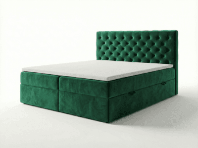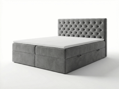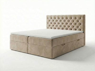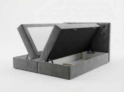 - Konstrukcja: Konstrukcja łóżka opiera się na trójkątnych ślizgach o wysokości 15 mm, co zapewnia cyrkulację powietrza pod łóżkiem. Szkielet wykonany z płyty wiórowej o grubości 16 mm, wzmocniony elementami drewnianymi. Całość pokryta pianką T25. Skrzynie na pościel wykonane z płyty wiórowej 16 mm, w białym laminacie. Łóżko posiada mocne automaty ze sprężynami, które wspomagają otwieranie pojemników na pościel. Łóżko składa się z wbudowanego materaca bonellowego lub pocketowego (do wyboru), który z góry zaszyty jest tkaniną Anty Slip, dzięki której topper nie przesuwa się. Łóżko tapicerowane dostępne w rozmiarach 140×200 cm, 160×200 cm, 180×200 cm. Zagłowie mocowane przy użyciu 4 śrub 8 mm, co zapewnia jego stabilność.