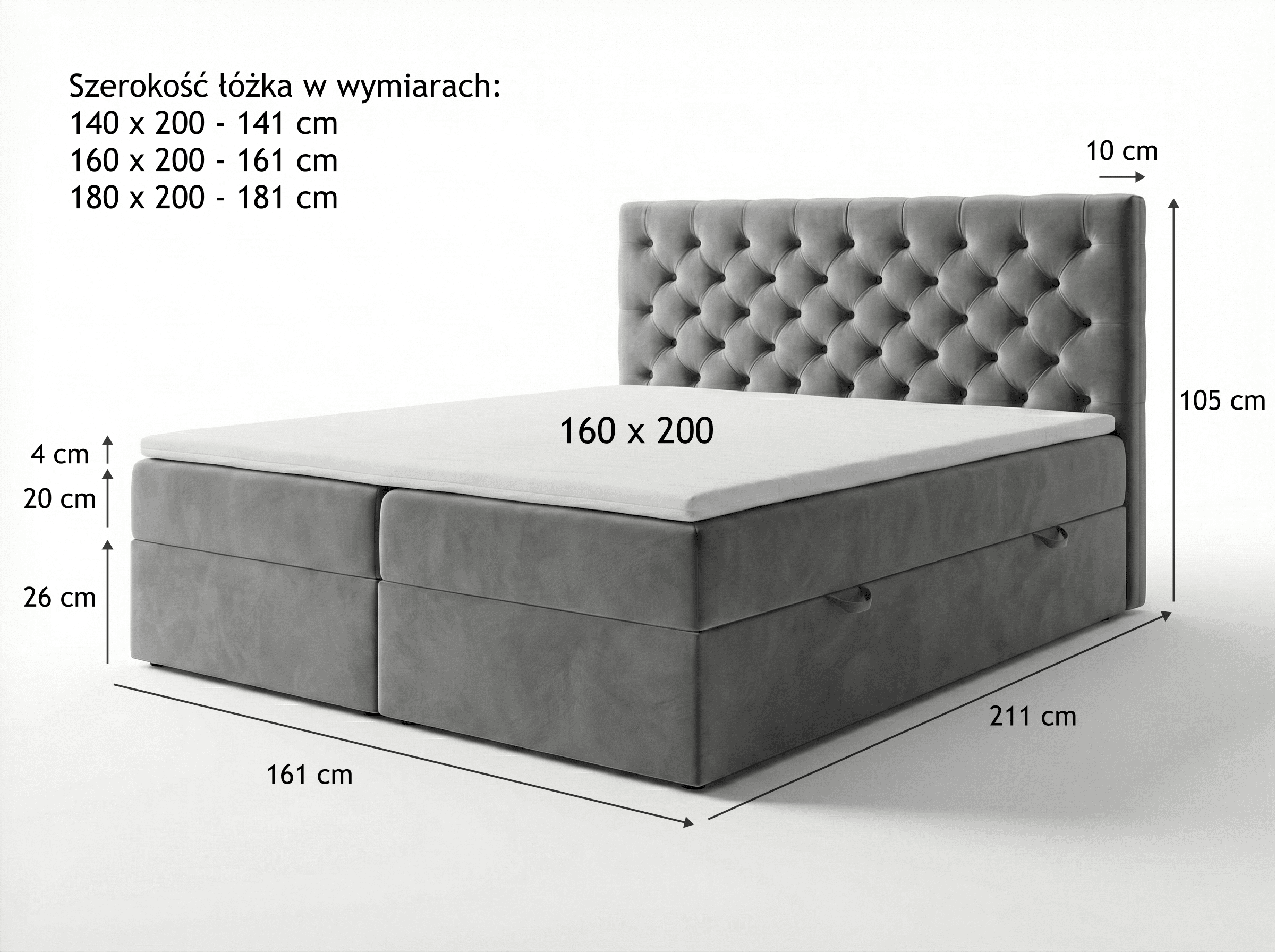 Tolerancja wymiarów +/- 2 cm. Wysokość wezgłowia taka sama dla każdego rozmiaru łóżka.
