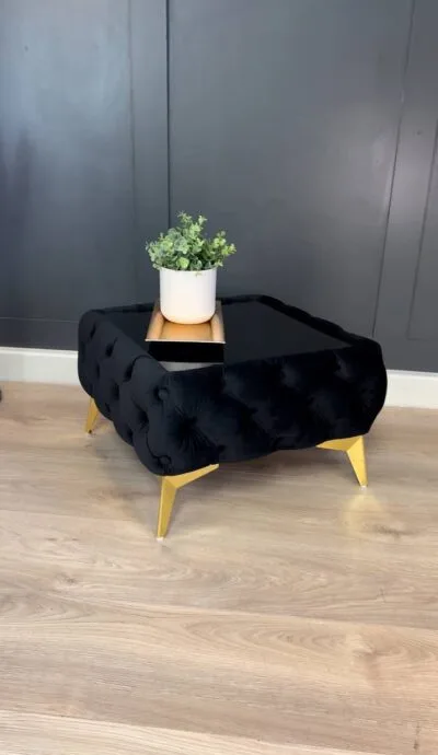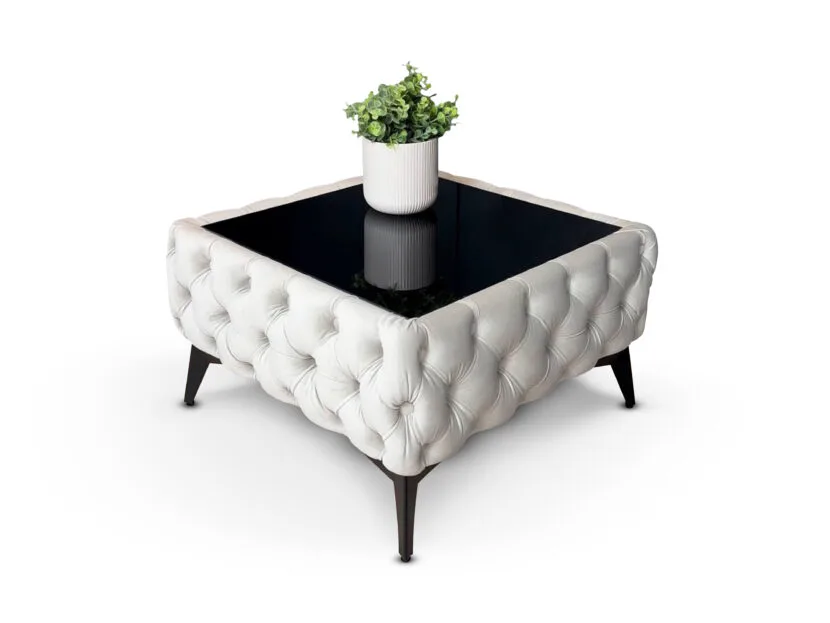 • Konstrukcja: Szkielet wykonany z płyty wiórowej o grubości 16 mm, wzmocniony elementami drewnianymi. Całość pokryta pianką T25 o grubości 5 cm+1 cm owaty. Konstrukcja stolika opiera się na nóżkach (złote, czarne lub chrom) o wysokości 13,5 cm. Blat stolika wykonany ze szkła lacobel o wymiarach 50 cm x 50 cm.