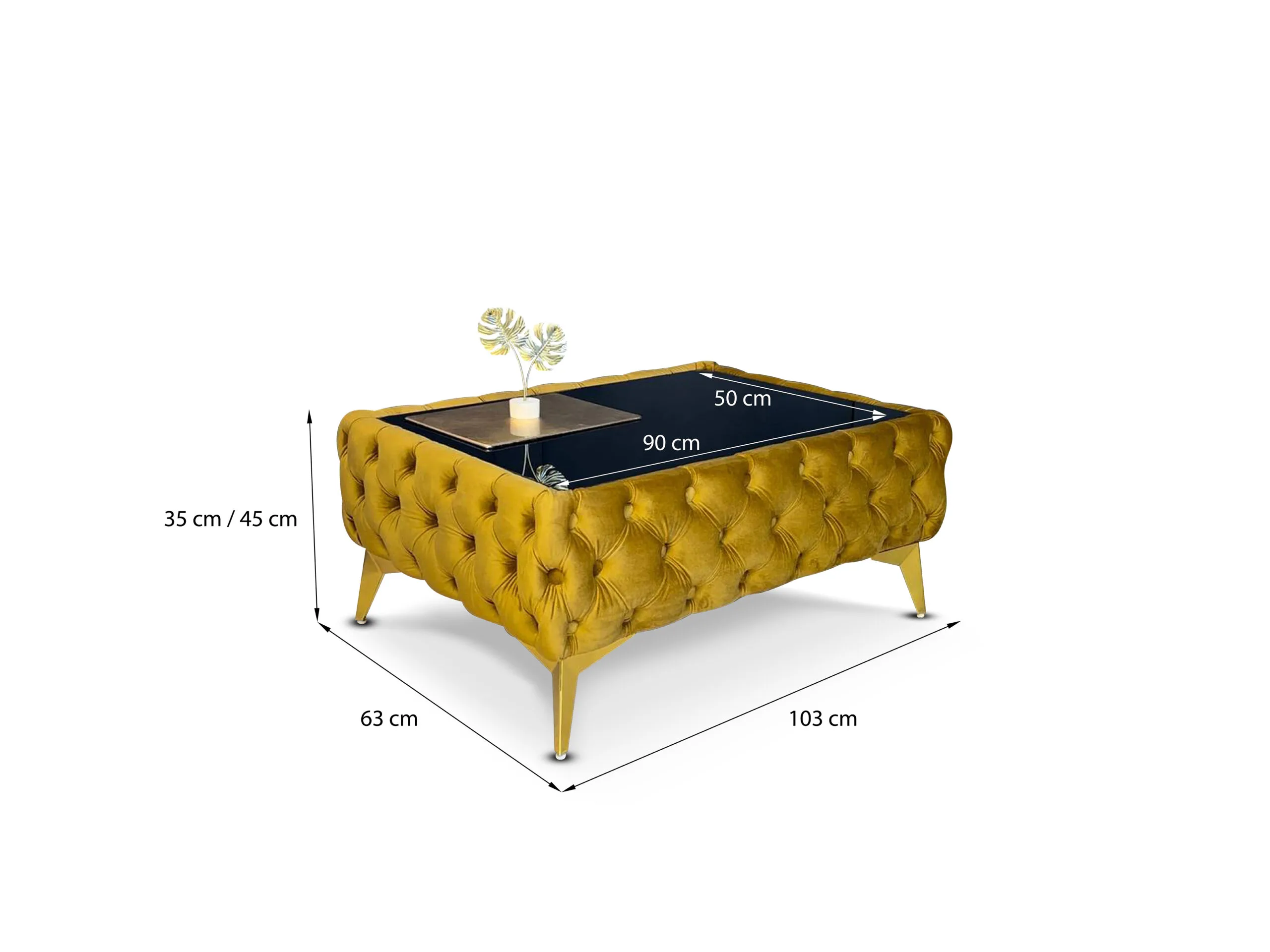 • Konstrukcja: Szkielet wykonany z płyty wiórowej o grubości 16 mm, wzmocniony elementami drewnianymi. Całość pokryta pianką T25 o grubości 5 cm+1 cm owaty. Konstrukcja stolika opiera się na nóżkach (złote, czarne lub chrom) o wysokości 13,5 cm. Blat stolika wykonany ze szkła lacobel o wymiarach 50 cm x 90 cm.